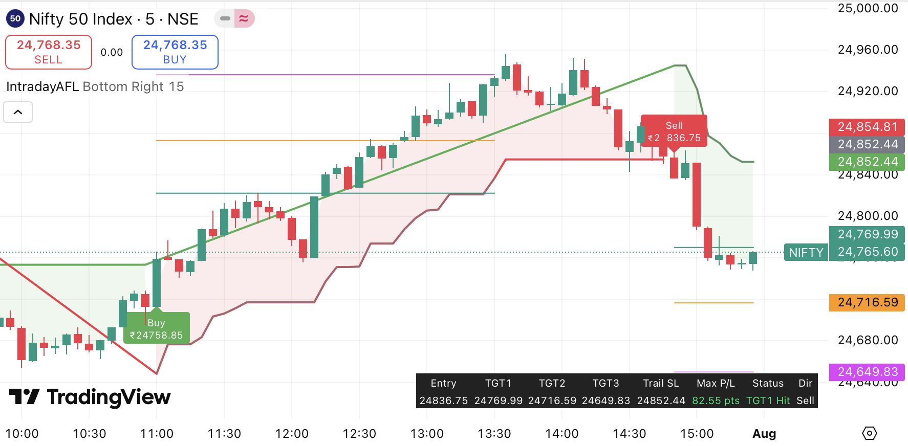 On the 15-minute chart, a double-top formation was visible near 24,920, signaling a bearish reversal. The index broke below intraday support of 24,800, confirming weakness.